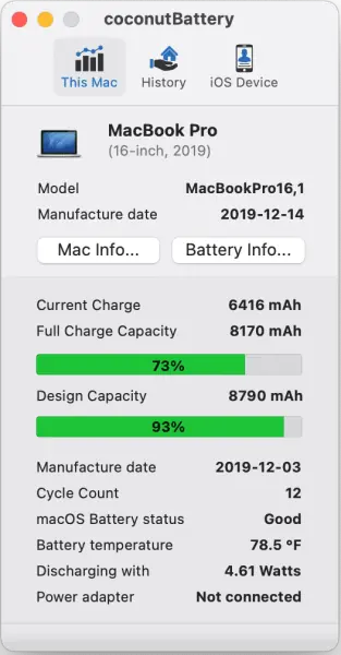 Coconut Battery est un utilitaire gratuit permettant d'afficher simplement les informations de la batterie, son état, son autonomie. Il est très utile pour savoir si votre batterie a besoin d'être remplacée. Télécharger Coconut Battery ↗